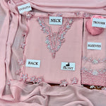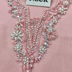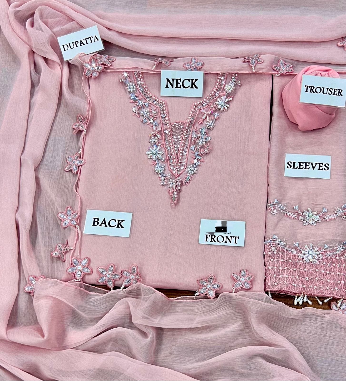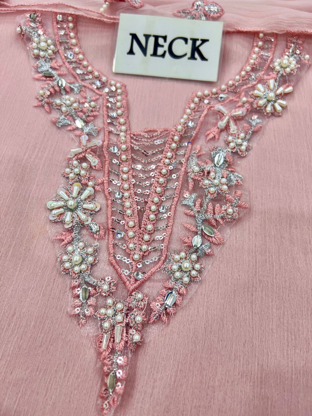 CHIFFON DYED FRONT ALONG WITH ELEGANT EMBROIDERED NECK PATCHES WITH HEAVY ADDA WORK